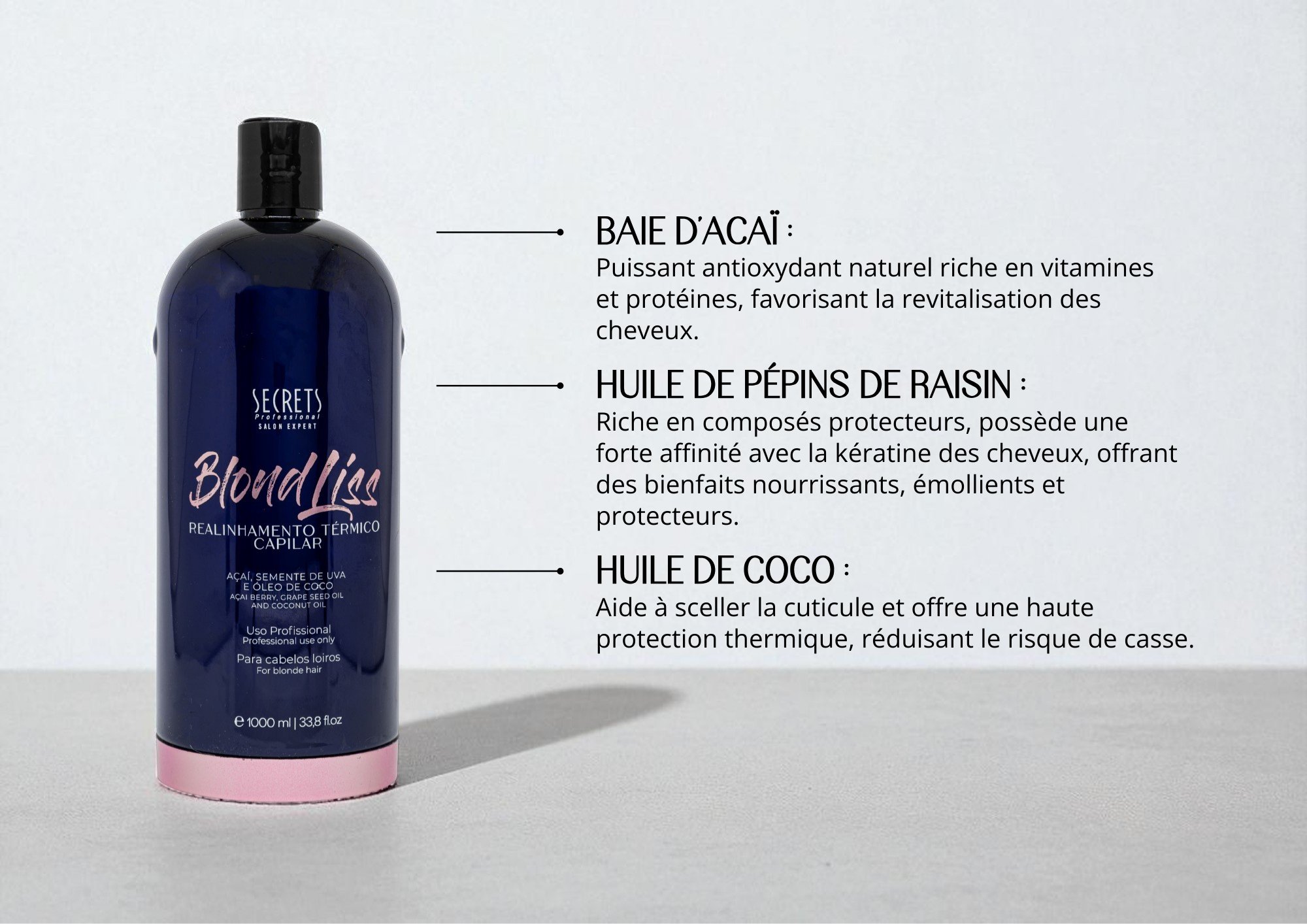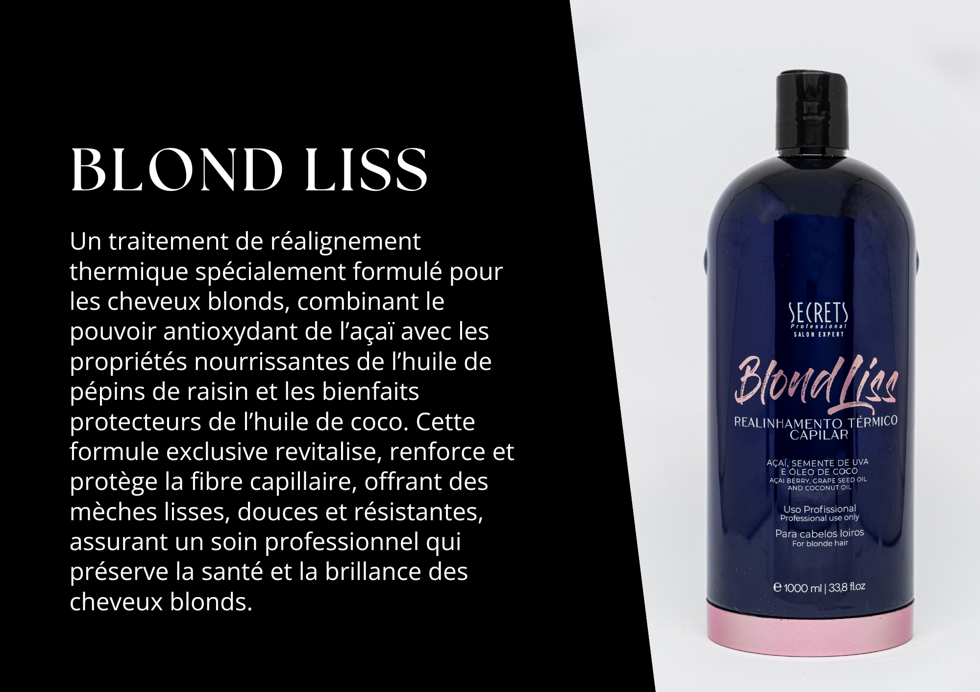 Un lissage thermique spécialement développé pour les cheveux blonds, qui combine le pouvoir antioxydant de l’açaï, la nutrition de l’huile de pépins de raisin et la protection de l’huile de coco. Cette formule exclusive revitalise, renforce et protège la fibre capillaire, en offrant des cheveux disciplinés, doux et résistants, tout en préservant la santé et la brillance des cheveux blonds.